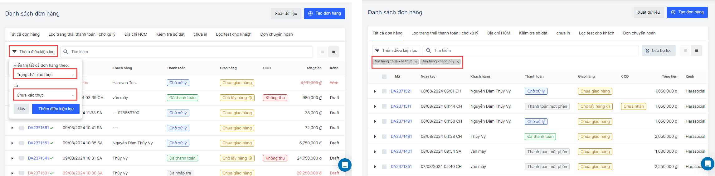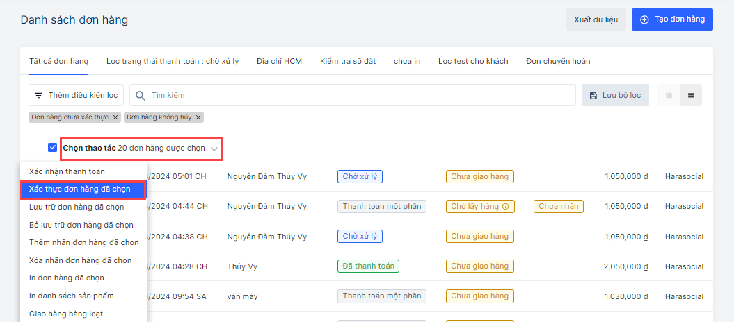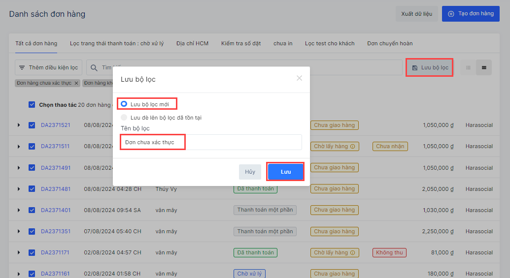 👉 Bạn nên lưu bộ lọc “Đơn hàng chưa xác thực” để thao tác nhanh hơn cho các lần sau.
