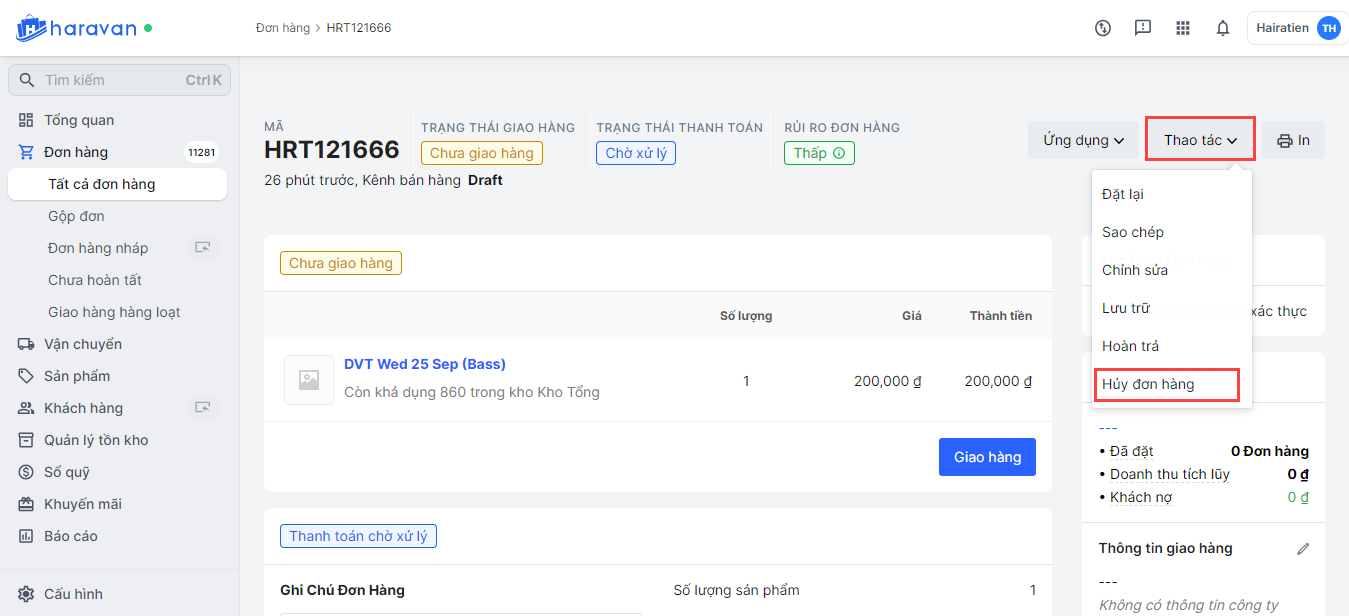 - Chọn Thao tác → Hủy đơn hàng