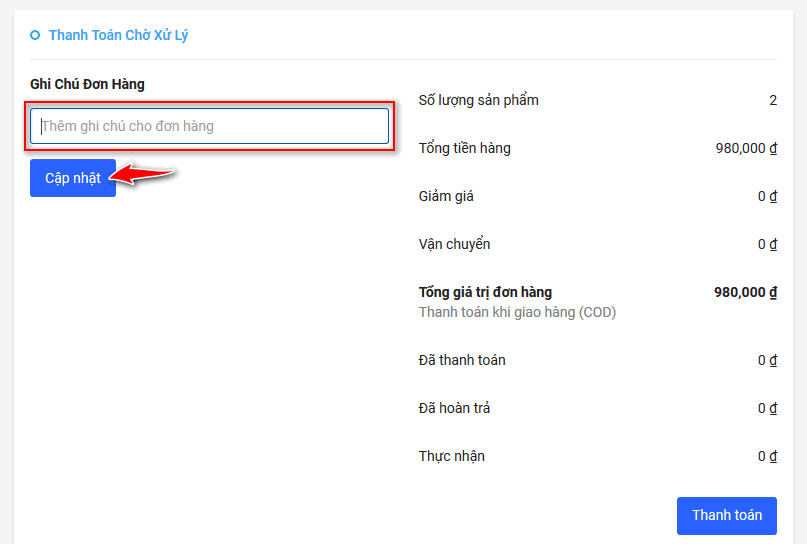 Để thêm hoặc cập nhật ghi chú cho đơn hàng, Nhà bán hàng nhập ghi chú, sau đó nhấn Cập nhật.