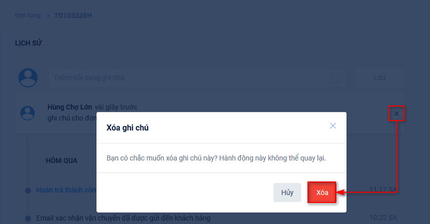 Xóa ghi chú lịch sử đơn hàng