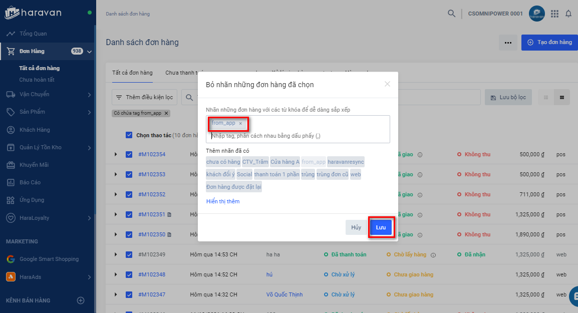 Bạn thực hiện thao tác này cho đến khi hết đơn hàng có gắn tag muốn xóa. Nếu bạn đã xóa hết nhưng vẫn thấy có đơn hàng trong bộ lọc, hãy thực load lại trang để load lại danh sách đơn hàng.