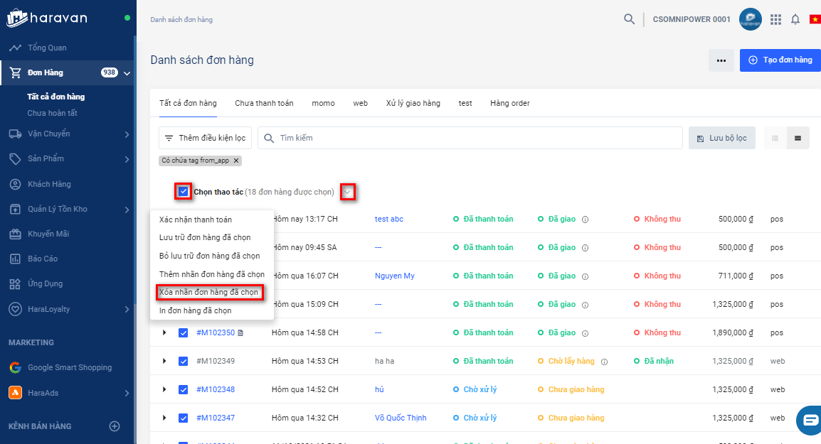 Bạn chọn vào ô vuông 1, chọn mũi tên kế bên và chọn Xóa nhãn đơn hàng đã chọn