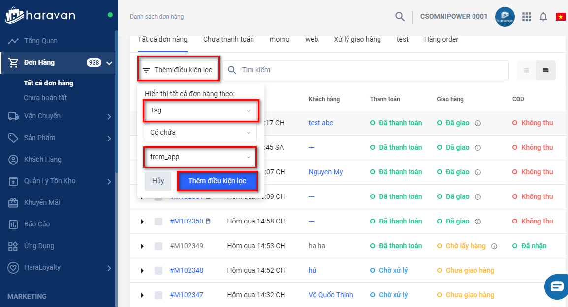 Bạn sẽ thực hiện lọc tất cả đơn hàng theo nhãn muốn xóa bằng chọn Thêm điều kiện lọc -> Lọc theo Tag có chứa tag bạn muốn xóa -> Thêm điều kiện lọc.