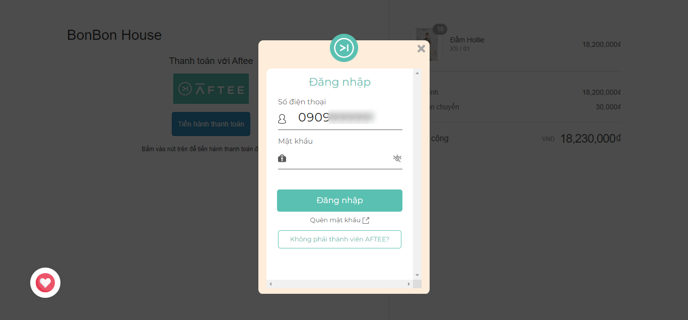 - Nếu nhà bán hàng đã thực hiện đăng kí tài khoản AFTE**E** với số điện thoại đã nhập ở phần thông tin giao hàng trước đó, hệ thống sẽ hiển thị pop up đăng nhập