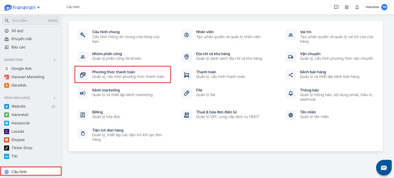 - Từ Trang quản trị, bạn chọn Cấu hình-> chọnPhương thức thanh toán