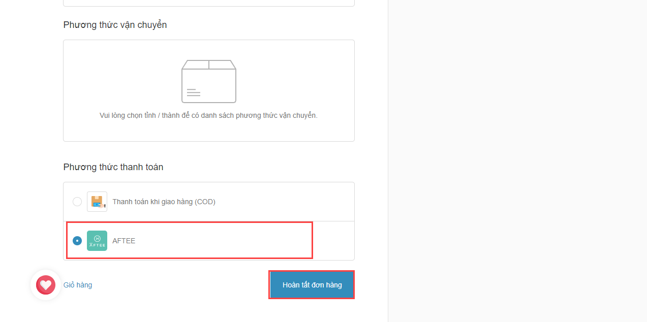 - Sau khi tích hợp vào Haravan, Khách mua hàng có thể lựa chọn phương thức thanh toán cổng thanh toán AFTEE khi thanh toán mua hàng. Khi Khách mua hàng nhấp chọn Hoàn tất đơn hàng, hệ thống chuyển hướng sang trang thanh toán AFTEE để Khách mua hàng thực hiện thanh toán.