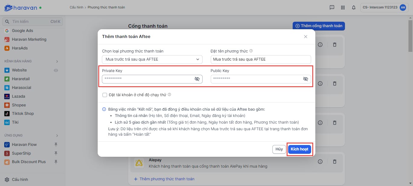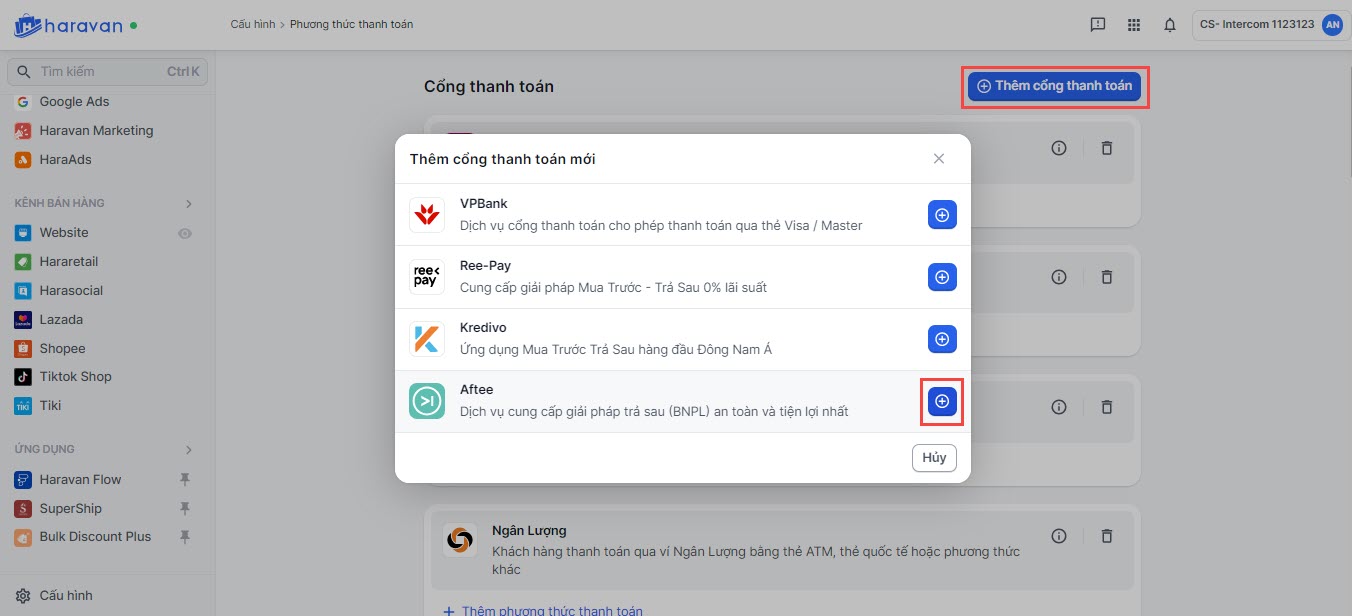 Bước 1: Kết nối cổng thanh toán AFTEE vào trang quản trị MyHaravan của bạn