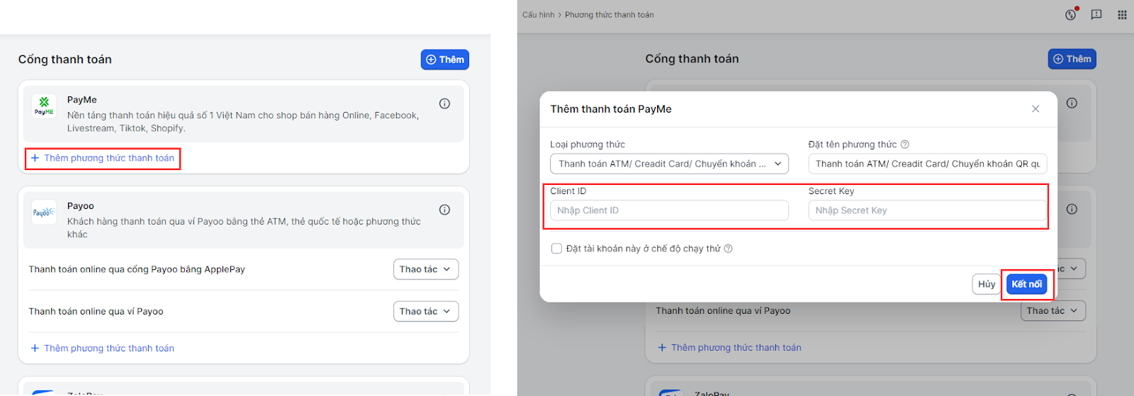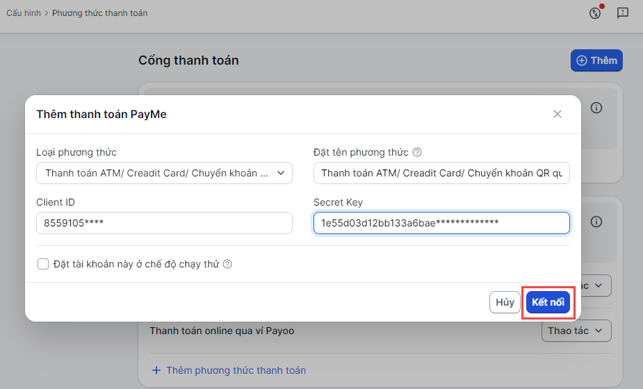 - Tại kết nối PayME, bạn chọn Thêm phương thức thanh toán. Nhà bán hàng điền các thông tin tích hợp:
