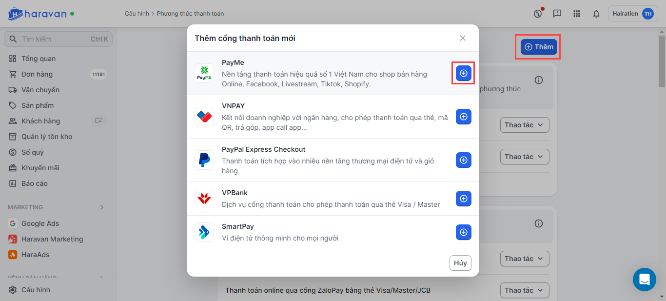 Kết nối cổng thanh toán PayME trên trang quản trị MyHaravan