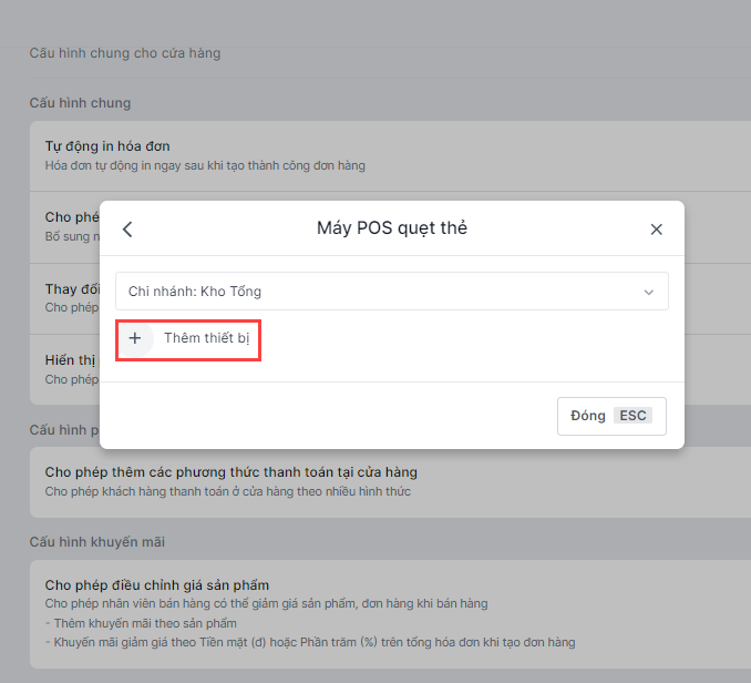Bước 2 Thêm thiết bị tài khoản thiết bị POS vào chi nhánh bán hàng