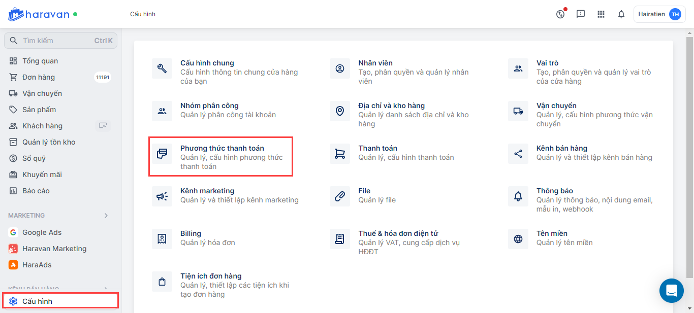 - Tại trang quản trị Haravan, chọn Cấu hình -> chọn Phương thức thanh toán