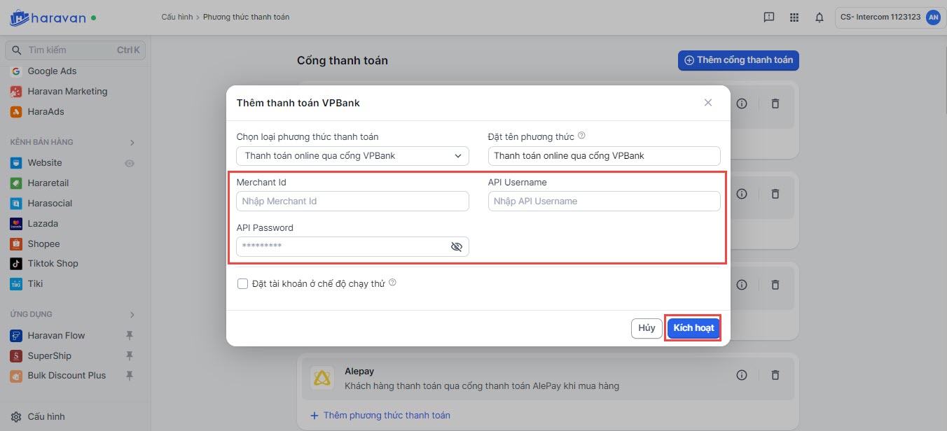 - Tại cấu hình kết nối VPBank, Nhà bán hàng chọnThêm p**hương thức thanh toán****