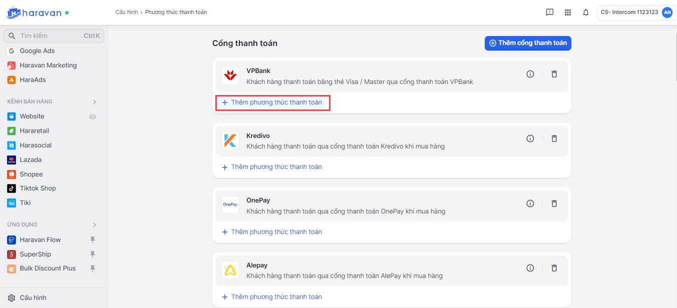 Từ Trang quản trị Haravan > Cấu hình > Phương thức thanh toán.