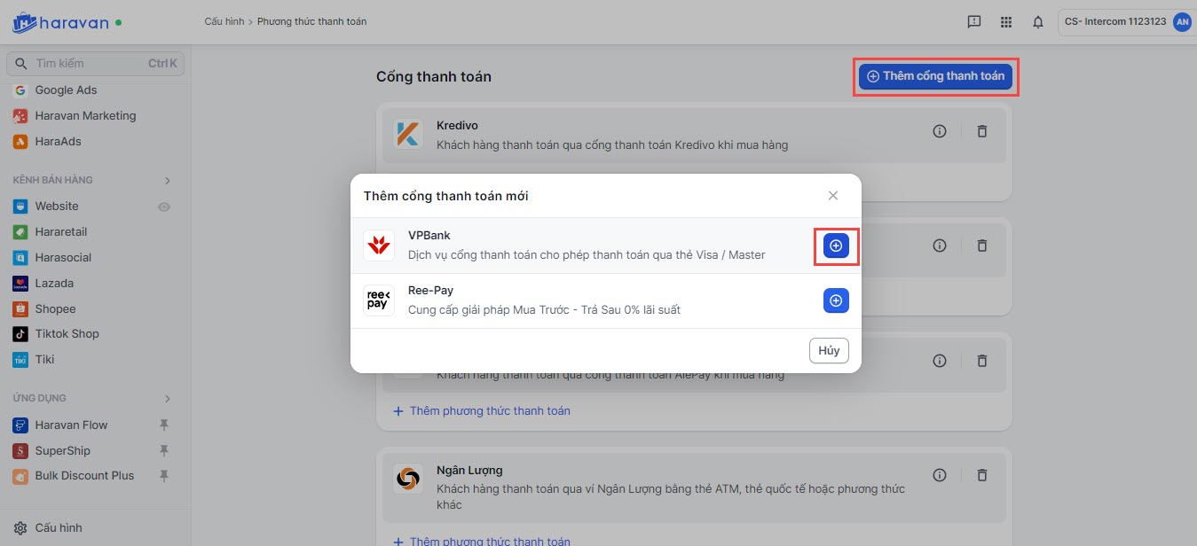 Nếu nhà bán hàng chưa thực hiện thêm cổng thanh toán VP Bank, chọn Thêm cổng thanh toán -> chọnbiểu tượng + bên cạnh cổng thanh toán VP Bank