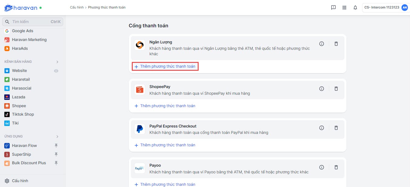 - Từ Trang quản trị Haravan > Cấu hình > Phương thức t**hanh toán**.