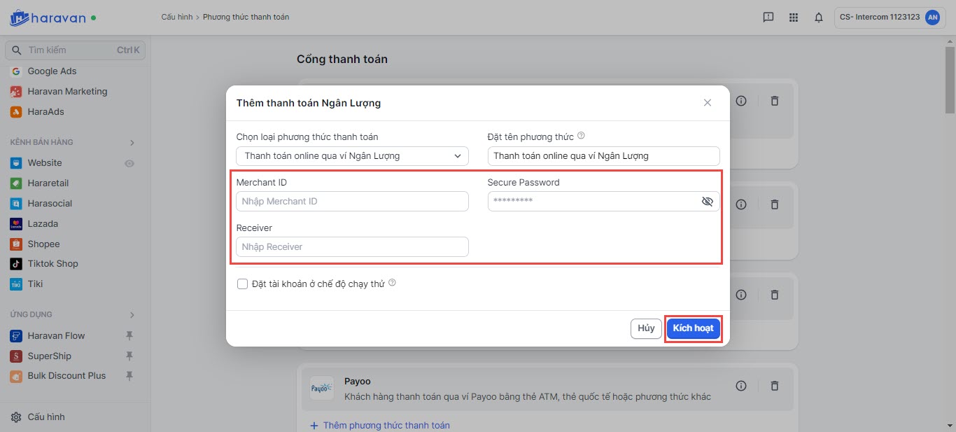 Sau khi đã đăng ký tài khoản và thực hiện kích hoạt, Nhà bán hàng thực hiện tích hợp Ngân Lượng trong Haravan: