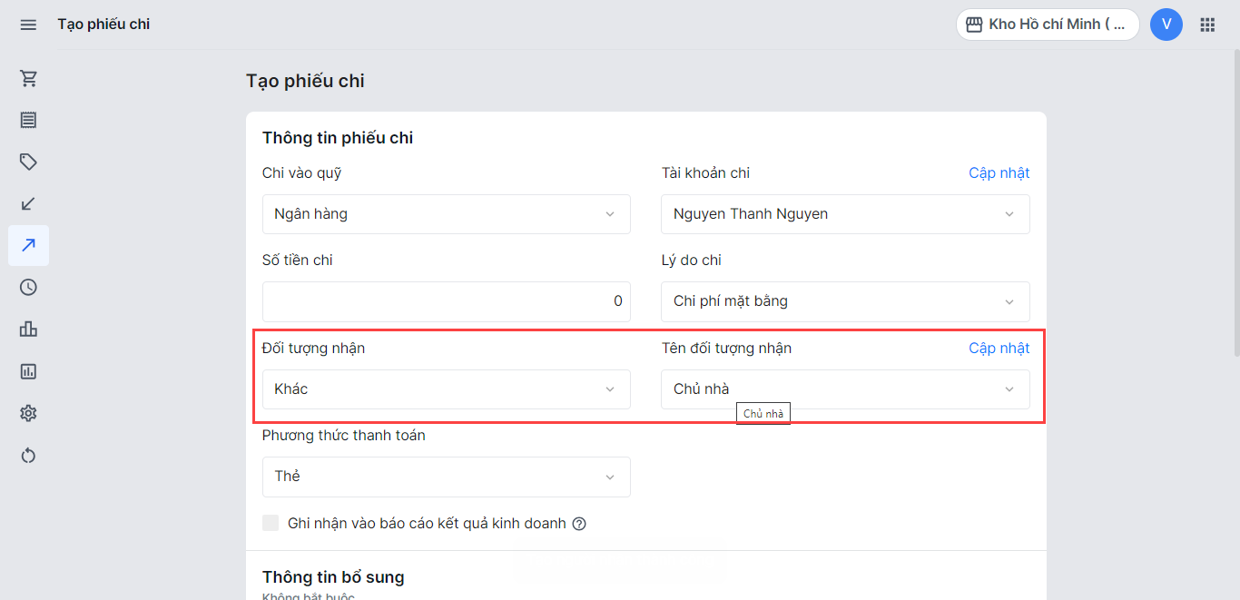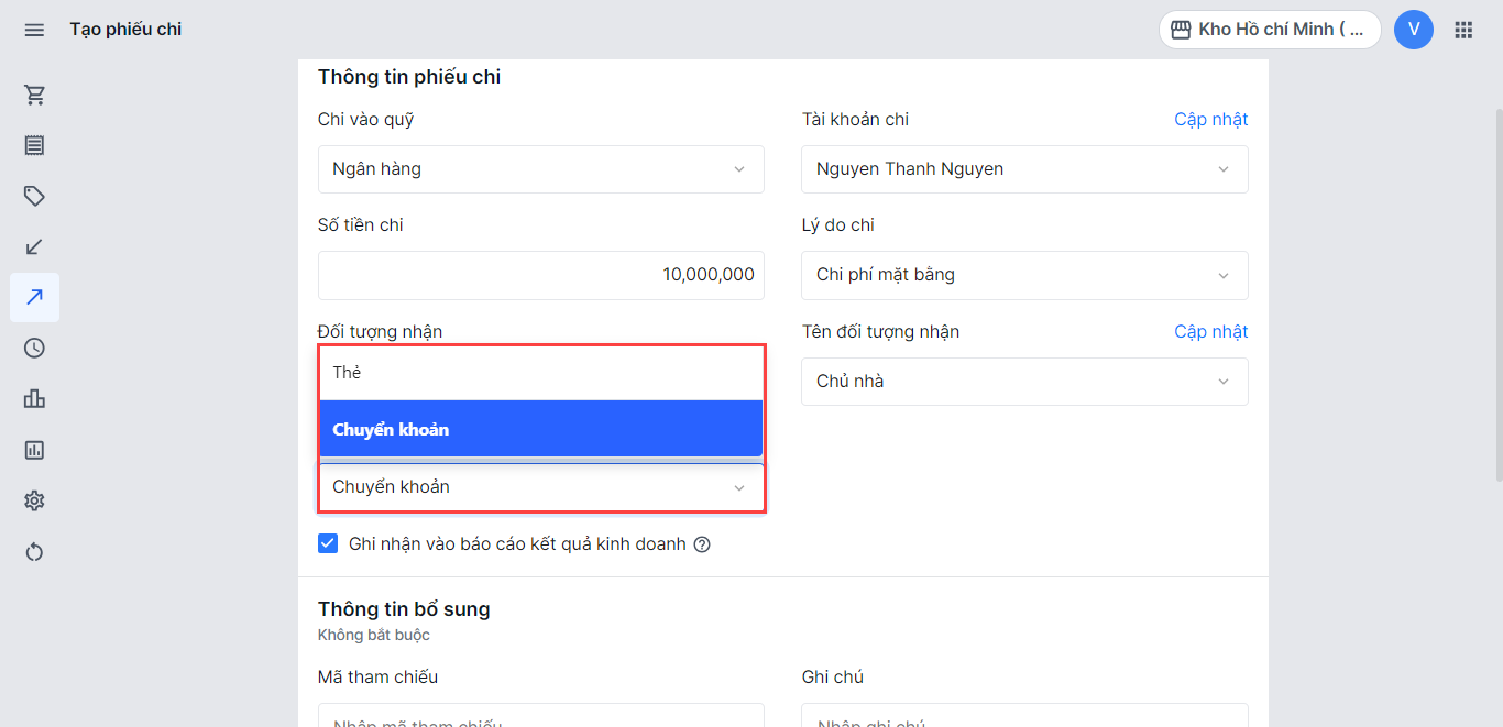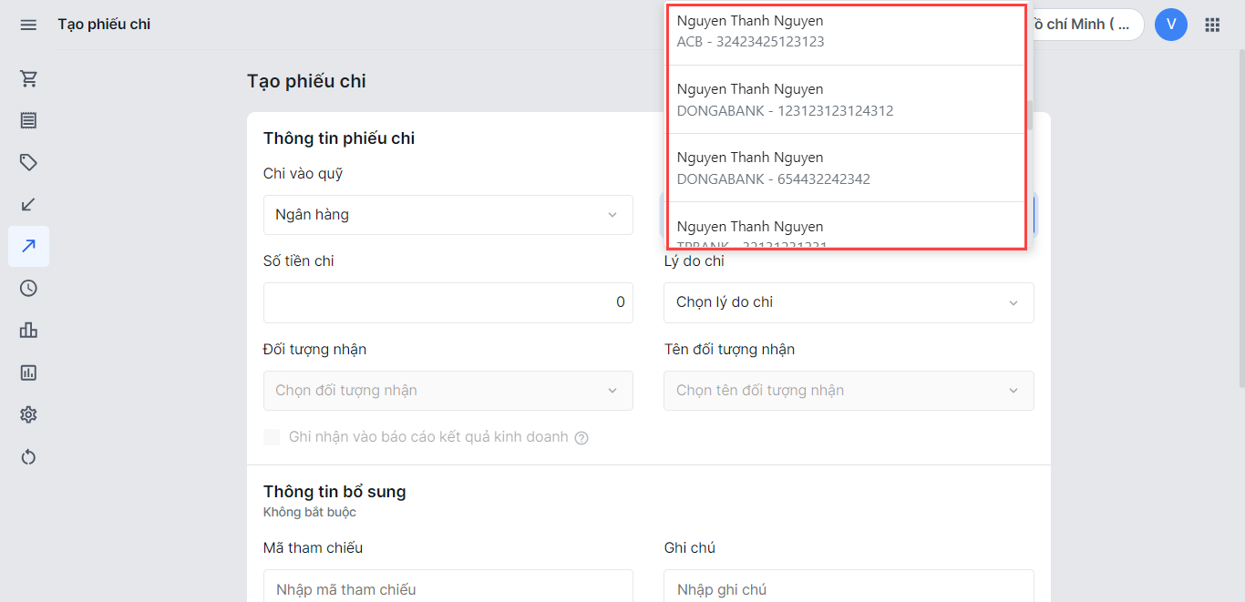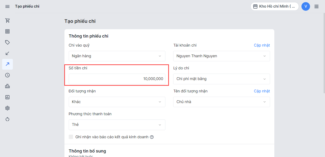 - Nếu chọn nguồn tiền là Ngân hàng, nhà bán hàng cần chọn Tài khoản đã thực hiện thao tác chi