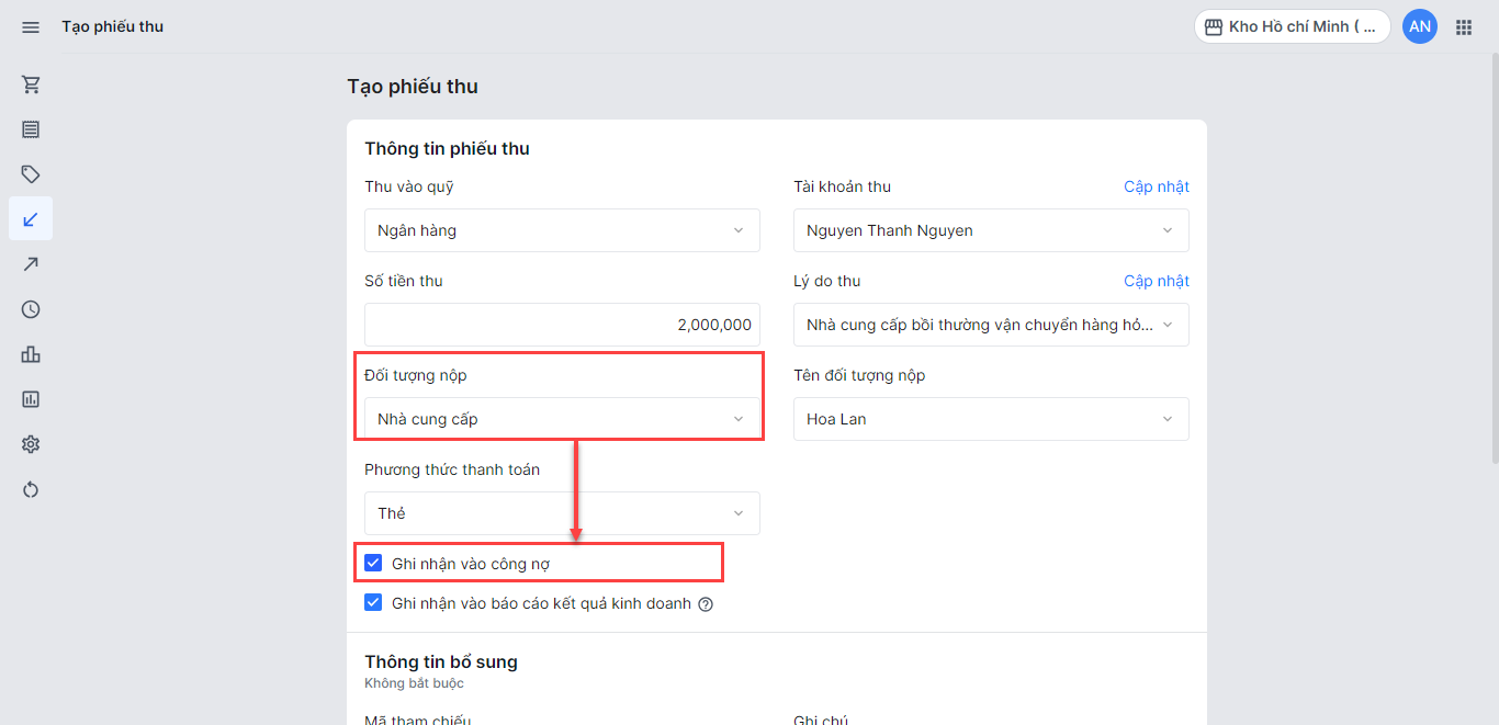 Nếu bạn thực hiện tạo phiếu thu nhận từ nhà cung cấp (ví dụ khi thực hiện trả hàng nhập), bạn cần chọn Ghi nhận vào công nợ (chỉ hiện khi chọn đối tượng nhận là nhà cung cấp) để hệ thống ghi nhận công nợ cho nhà cung cấp