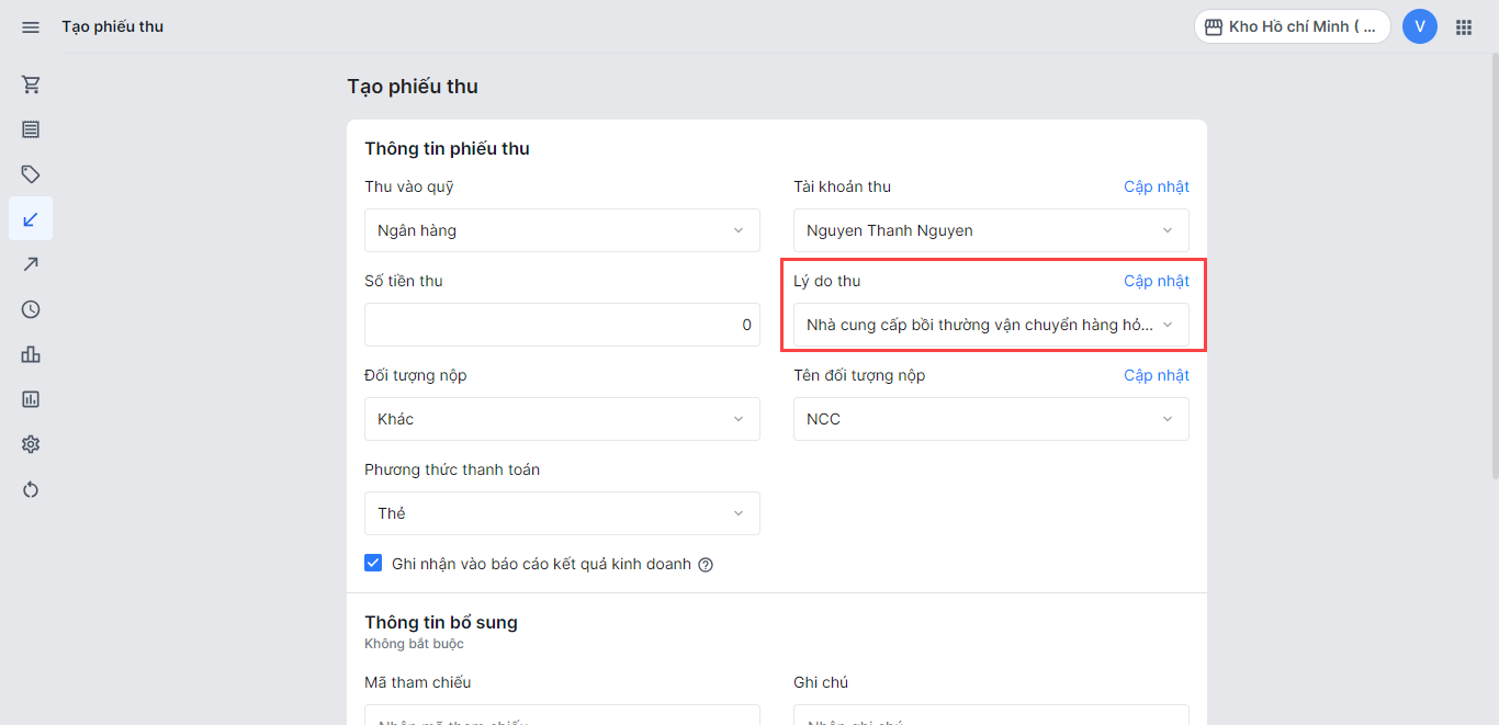 - Chọn lý do thu. Nếu lý do chi chưa có trong danh sách, có thể thêm lý do chi mới.