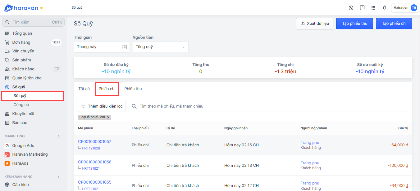 Các phiếu chi sau khi được tạo từ Haravan POS sẽ được ghi nhận vào mục Sổ quỹ tại admin Haravan.