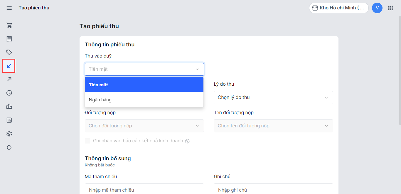 2. Chọn nguồn tiền thu: Tiền mặt hoặc Ngân hàng