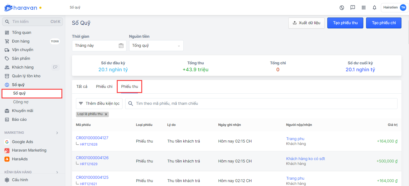Các phiếu thu sau khi được tạo từ Haravan POS sẽ được ghi nhận vào mục Sổ quỹ tại trang quản trị MyHaravan.