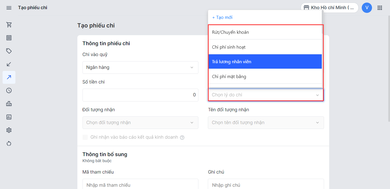 - Chọn lý do chi. Nếu lý do chi chưa có trong danh sách, có thể thêm lý do chi mới.