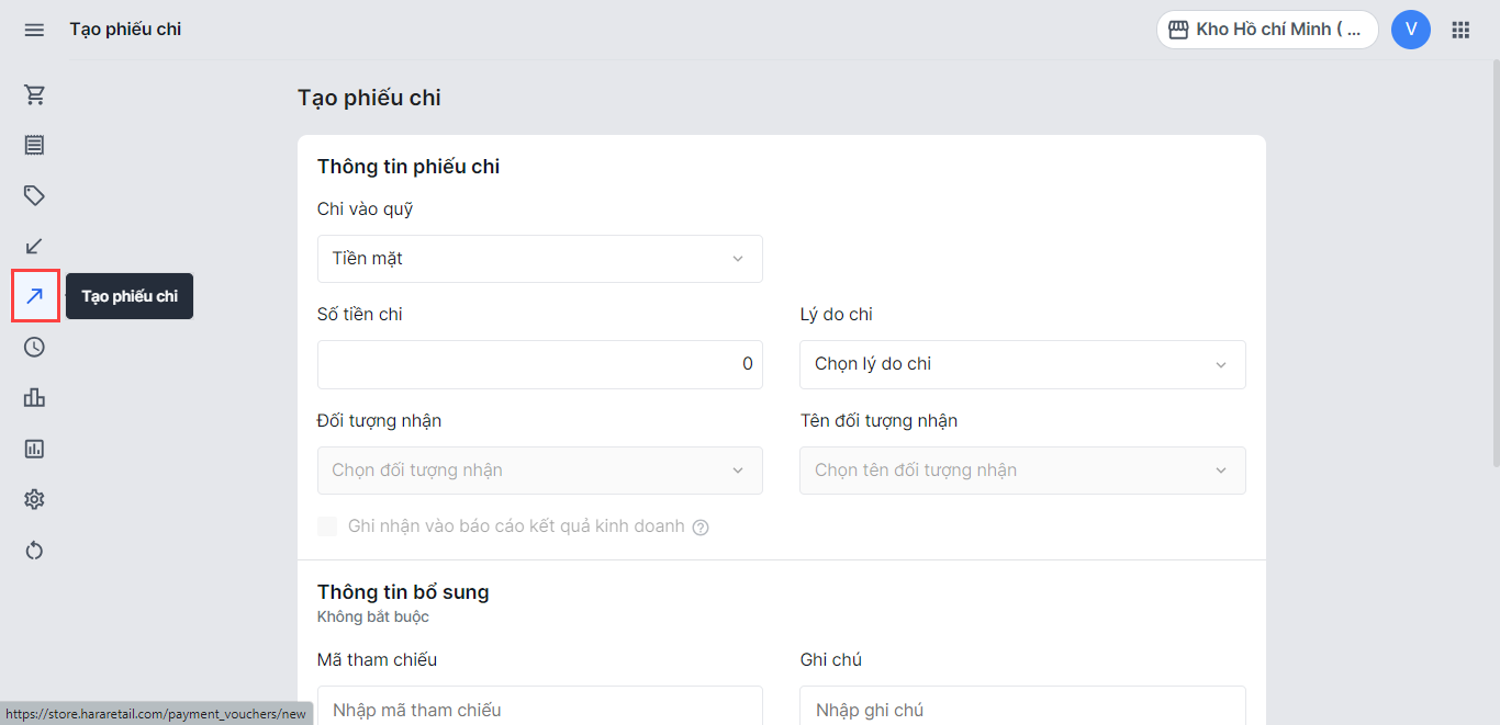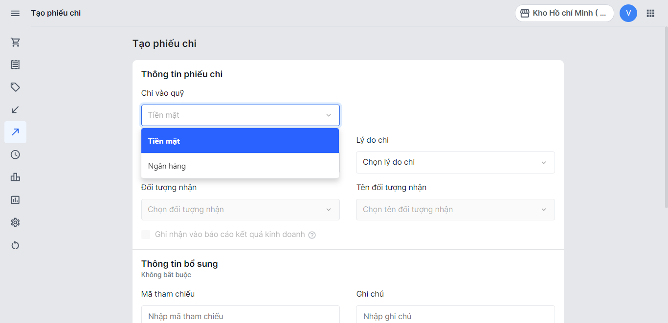 - Tại mục menu bên trái, bạn chọn Tạo phiếu chi
