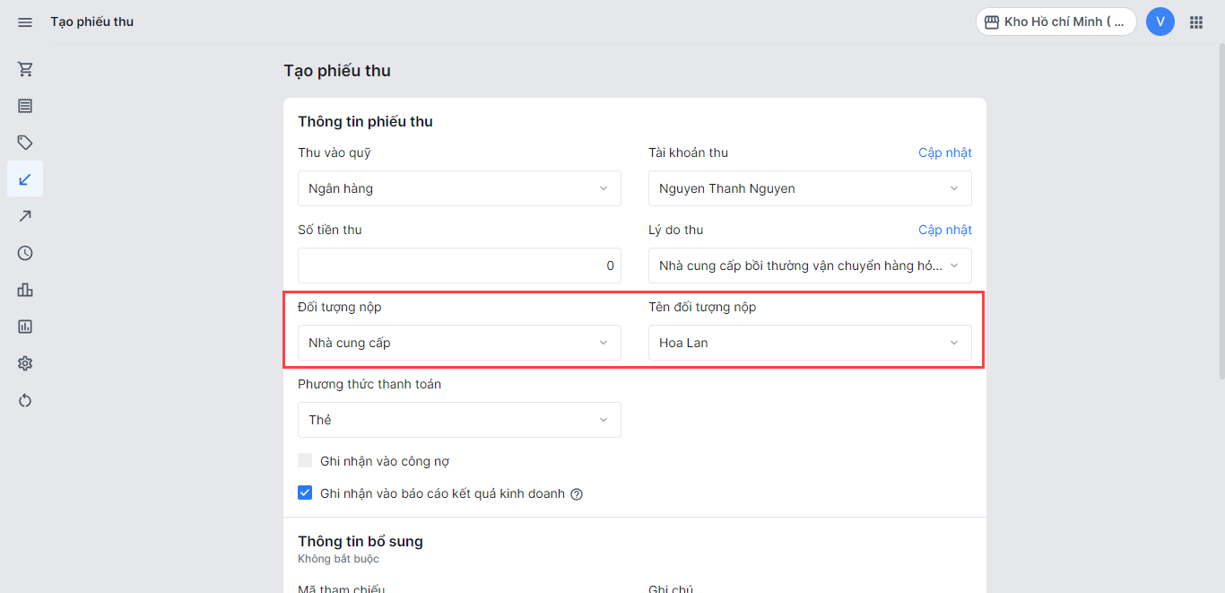 Trong trường hợp đối tượng nhận của bạn là Khách hàng hoặc Khác và chưa có trên hệ thống, bạn có thể chọn đối tượng là Khác và tạo mới một đối tượng mới để nộp tiền.