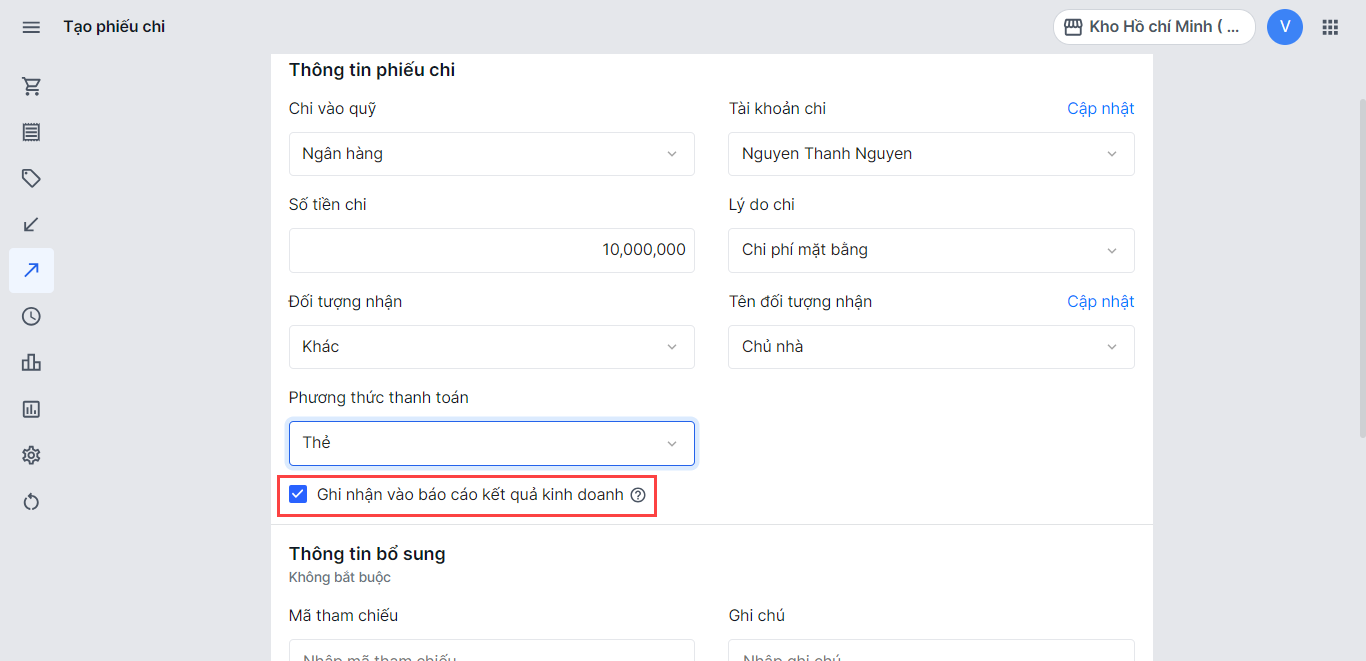 7. Nếu muốn ghi nhận khoản chi này vào "chi phí khác" trên báo cáo kết quả kinh doanh thì bạn chọn Ghi nhận vào báo cáo kết quả kinh doanh