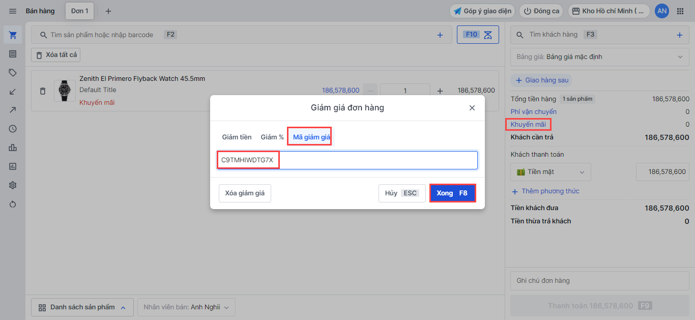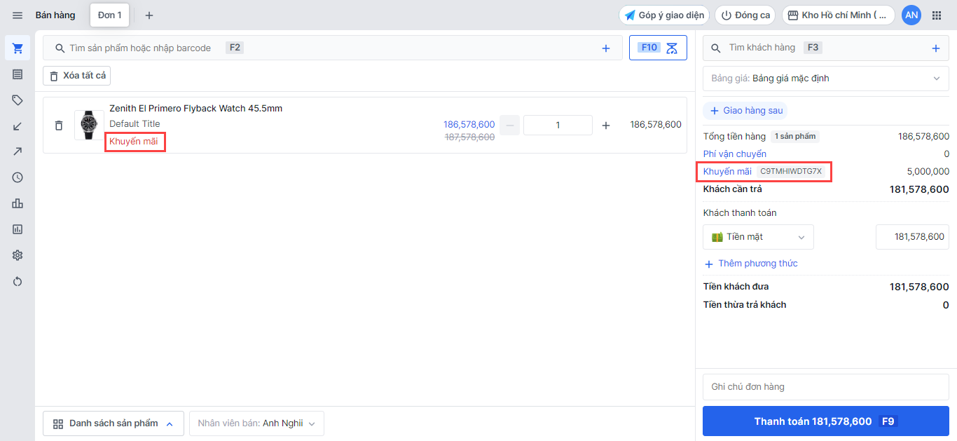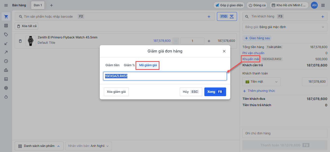 Để áp dụng mã khuyến mãi, bạn chọn mục Khuyến mãi -> chọn Mã khuyến mãi và áp mã khuyến**mãi đã tạo
