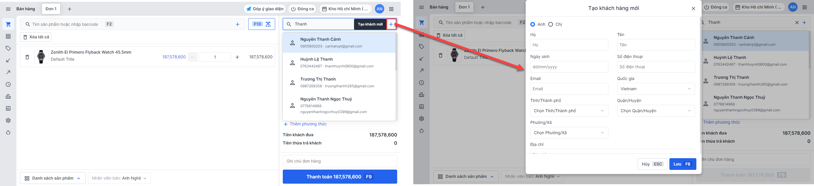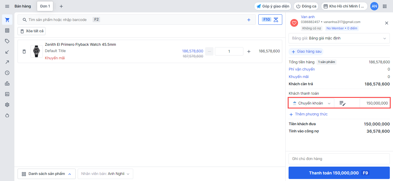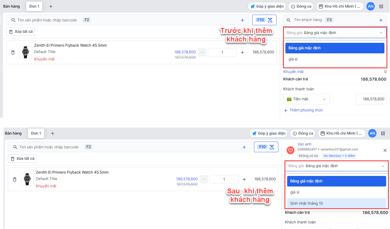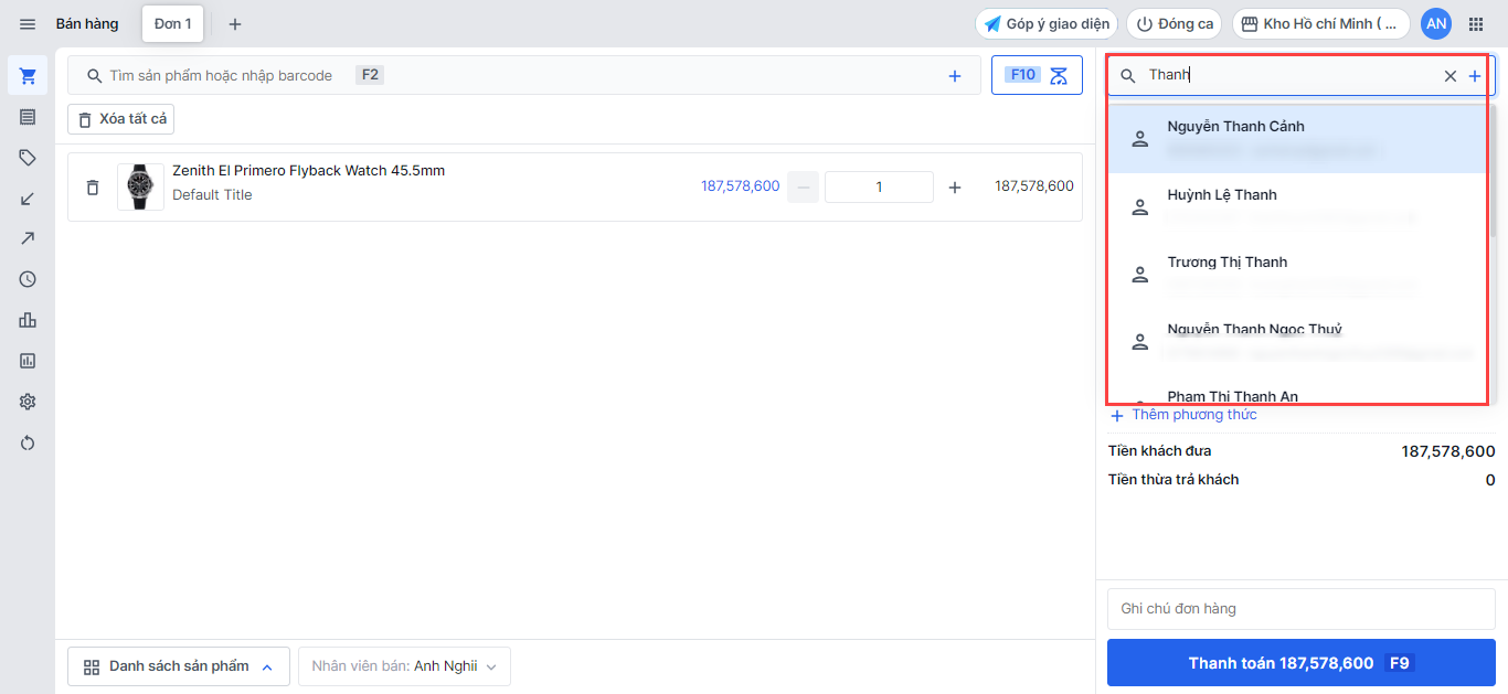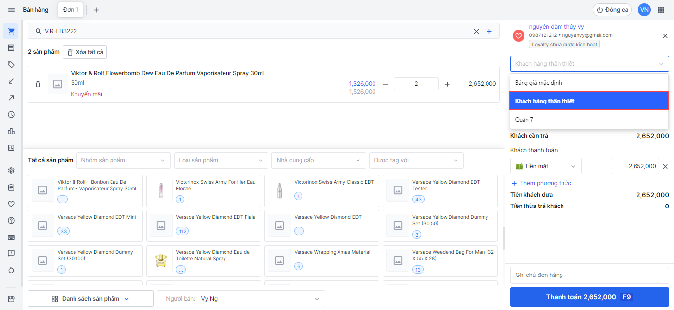Nếu khách hàng đã từng mua tại cửa hàng và có lưu lại thông tin, nhân viên nhập số điện thoại/email vào ô tìm kiếm, hệ thống sẽ hiển thị thông tin đã lưu