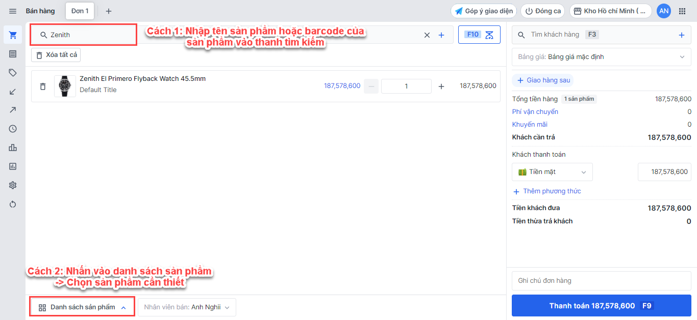 - Cách 2: Nhấn vào danh sách sản phẩm -> Tìm kiếm và chọn sản phẩm cần thiết