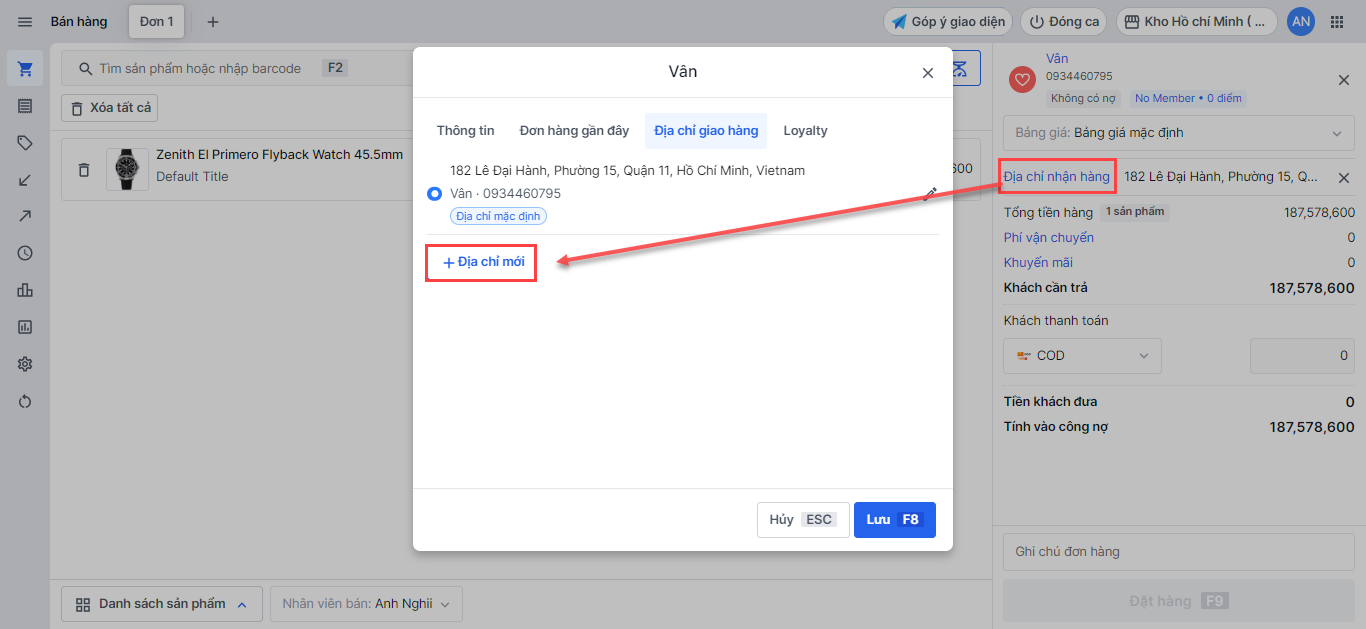 Nếu bạn muốn thêm địa chỉ giao hàng mới, bạn chọn Địa chỉ nhận hàng -> chọn Địa chỉ mới