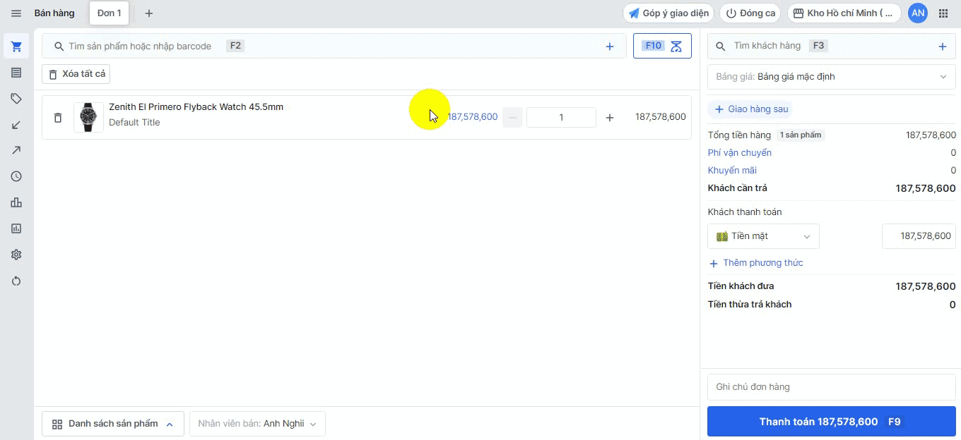 Tại mục Khách thanh toán, bạn thực hiện **nhập số tiền thanh toán trước của khách hàng (nhà bán có thể chọn hình thức thanh toán khác Tiền mặt)