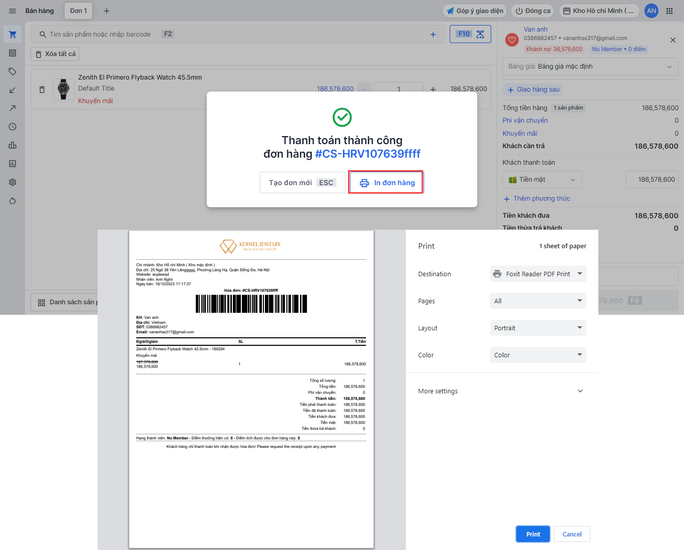 Sau khi đã hoàn tất thanh toán, hệ thống sẽ thông báo đơn hàng thành công và hiển thị pop up in đơn hàng. Nhà bán hàng chọn In đơn hàng và chọn Print để in đơn hàng