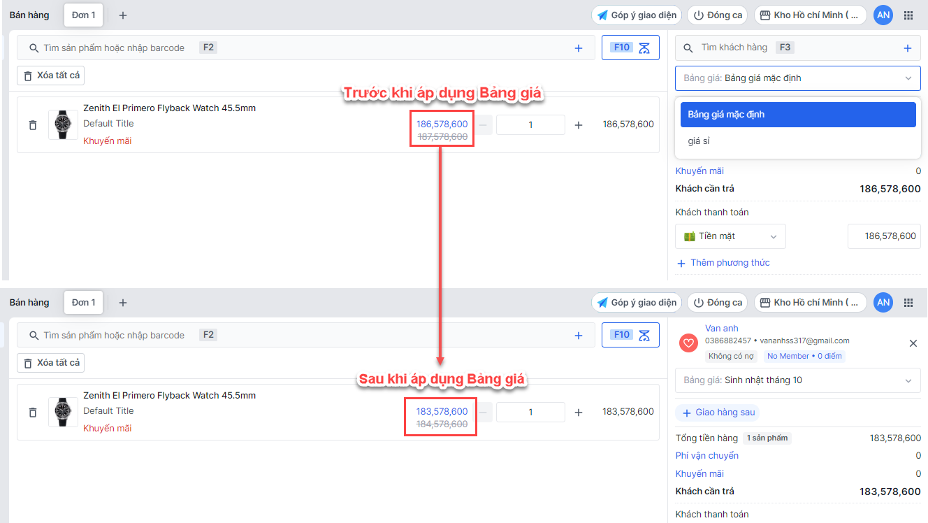 Sau khi thực hiện thêm sản phẩm vào đơn, nhà bán hàng chọn Bảng giá muốn áp dụng cho sản phẩm.