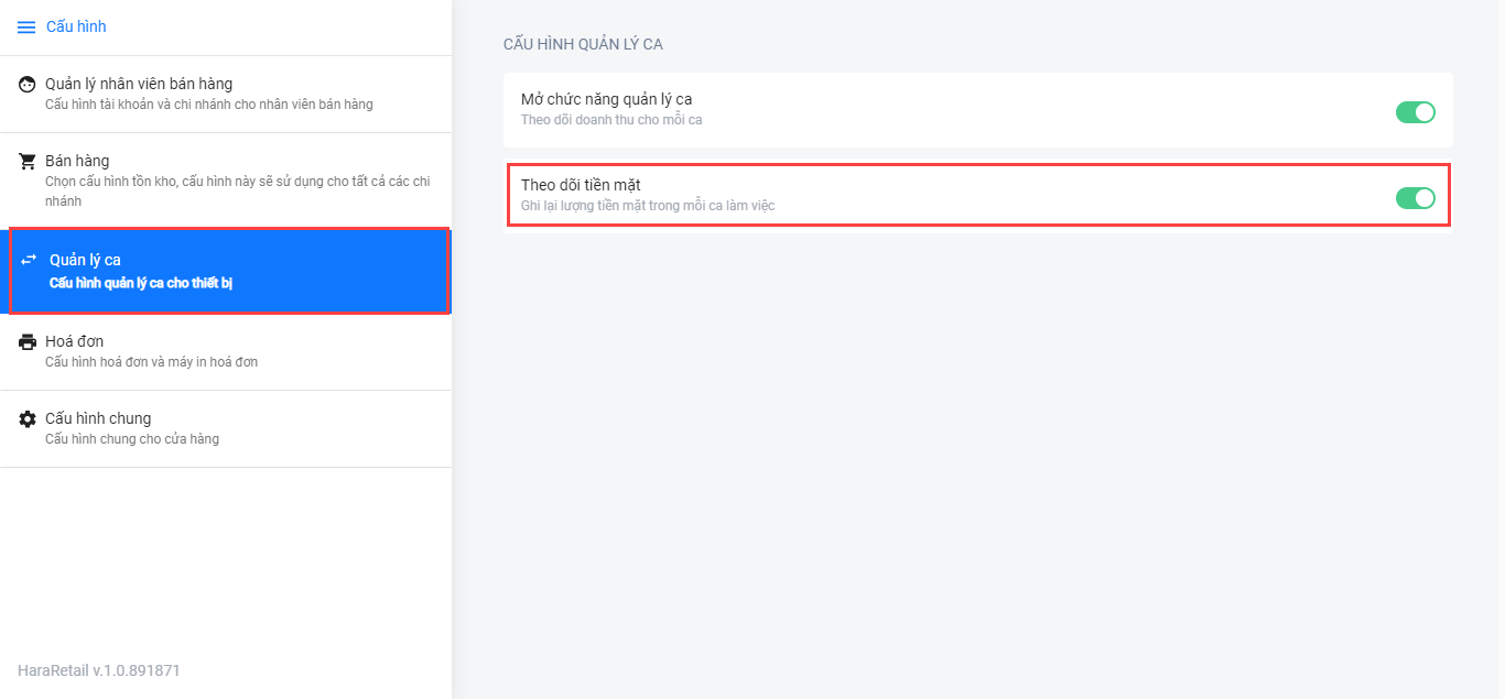 Nếu nhà bán hàng không mở Theo dõi tiền mặt trong mục Cấu hình trong giao diện Website của Haravan POS, mục tiền tạm ứng đầu ca sẽ không hiển thị trong phần Mở ca trên ứng dụng.