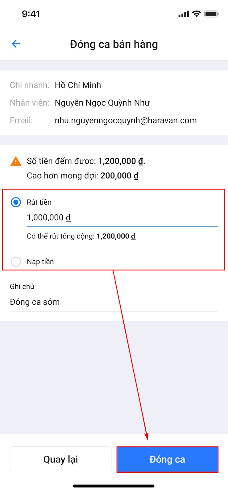 - Hệ thống sẽ hiển thị số tiền chênh lệch giữa số tiền thực tế đếm được và số tiền được ghi nhận được ghi nhận trên ứng dụng. Sau đó bạn chọn Rút tiền hoặc Nạp tiền và chọn Đóng ca để hoàn tất.