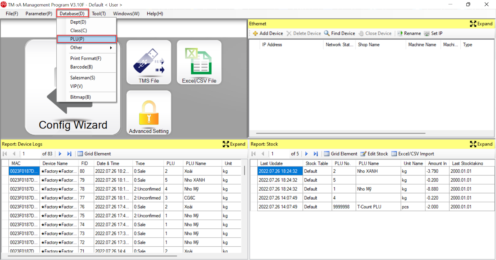 - Chọn Database (D) → Chọn PLU: