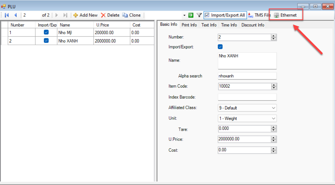 - Hệ thống sẽ hiển thị file sản phẩm đã được nhập vào app. Chọn Ethernet để truyền dữ liệu vào cân