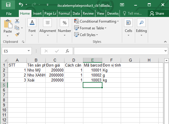 3. Sau khi đã tải file về máy, bạn thực hiện copy thông tin sản phẩm từ file dữ liệu Haravan đã tải về trước đó, bao gồm STT, Tên, Đơn giá, Mã barcode, Đơn vị tính.