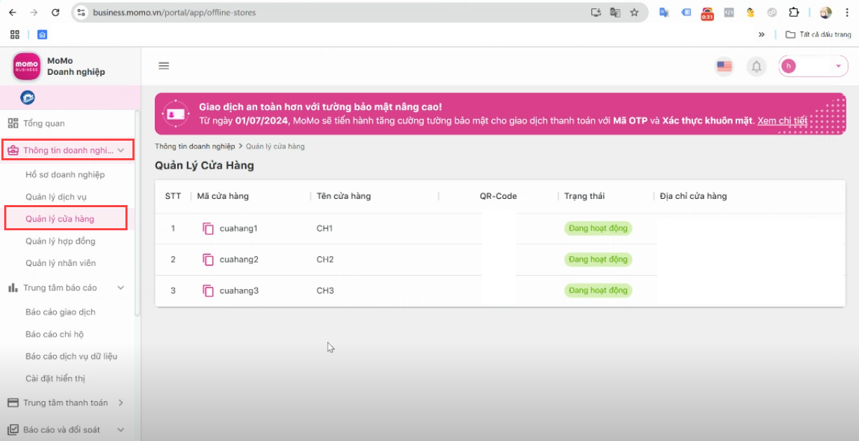 Hướng dẫn cài đặt MoMo thanh toán cho nhiều chi nhánh cửa hàng