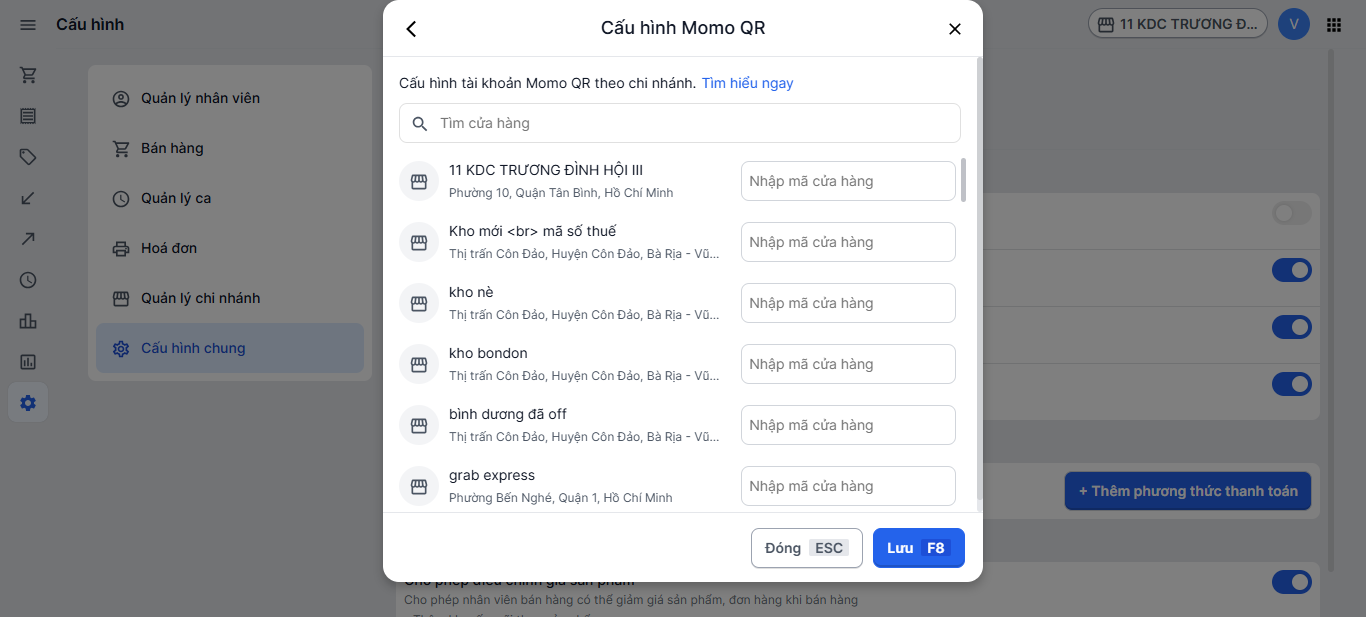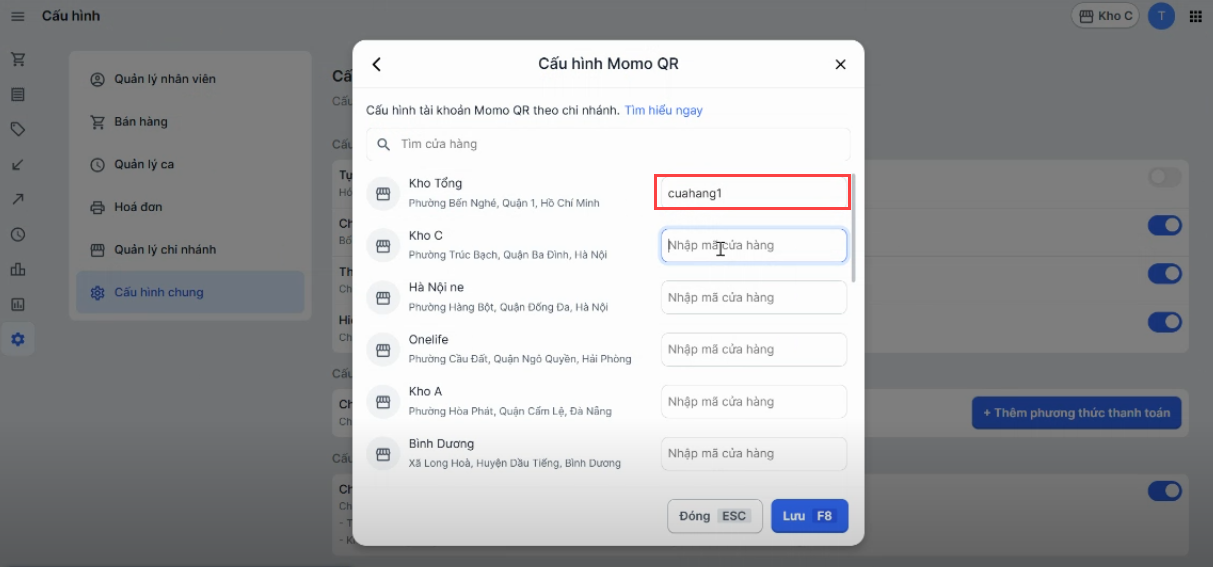 2. Nhà bán trở lại mục cấu hình quản lý cửa hàng MoMo QR trên Haravan POS và dán mã cửa hàng vào ô bên cạnh cửa hàng tương ứng ở Haravan. Chọn Lưu để hoàn tất.