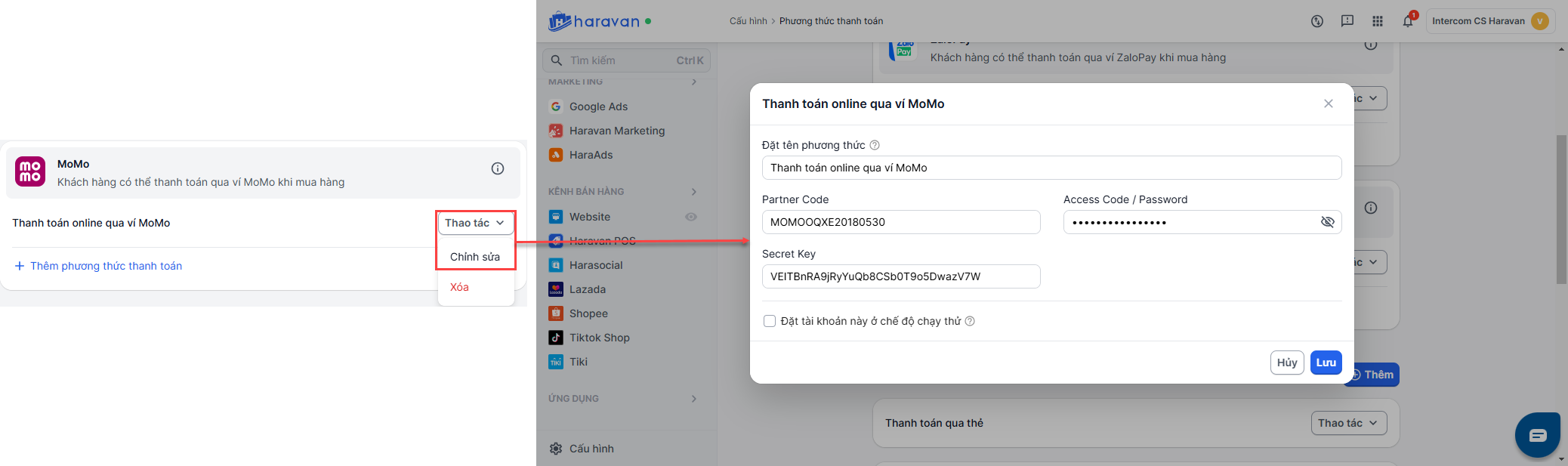 Bước 1 Kết nối phương thức MoMo QR ở cấu hình phương thức thanh toán