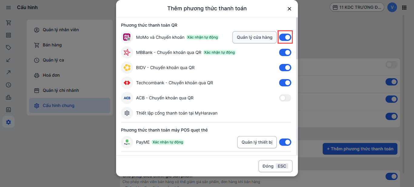 - Kích hoạt phương thức MoMo QR ở cấu hình chung trên Haravan POS