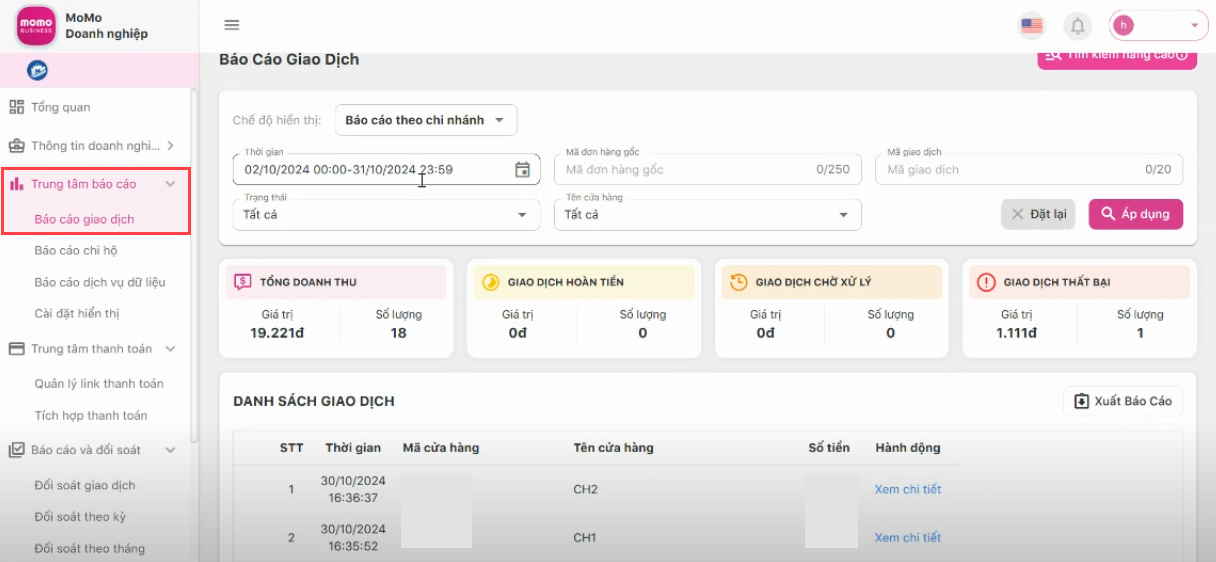 Xem thử báo cáo phân loại giao dịch theo từng chi nhánh trên MoMo Business
