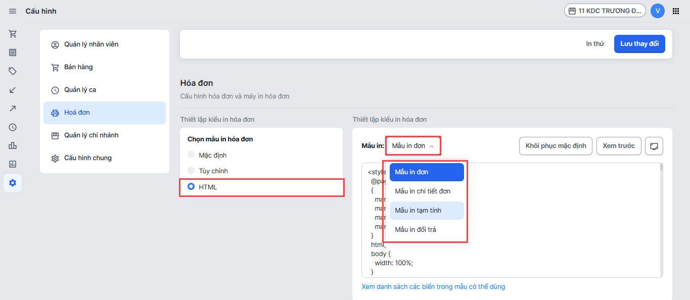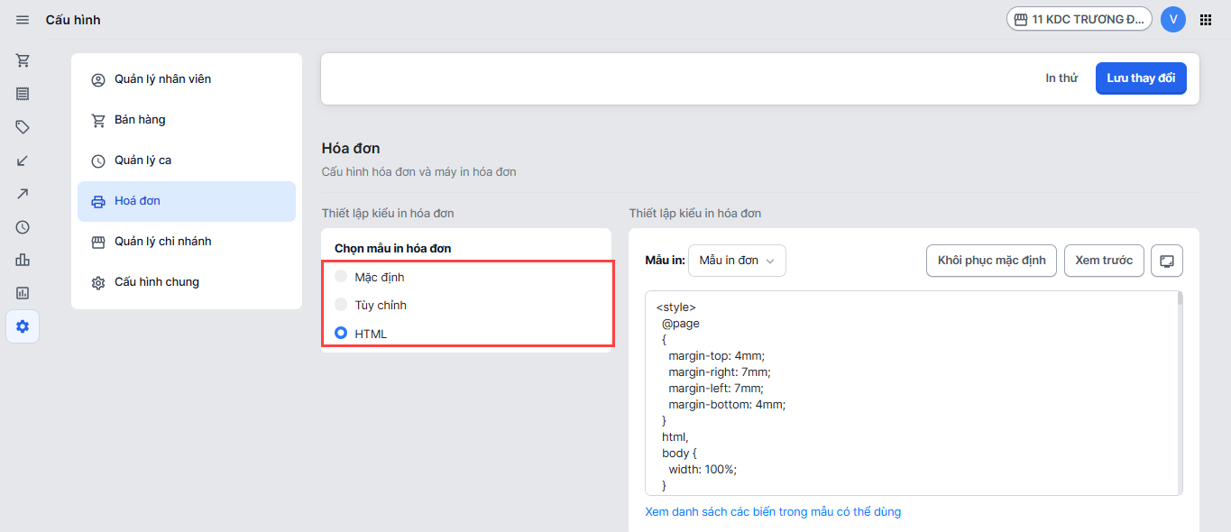 - Chỉnh sửa HTML mẫu in hóa đơn
