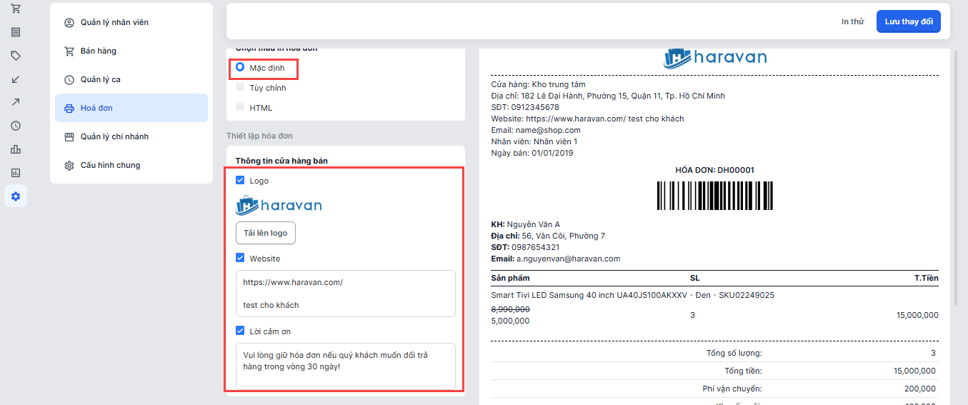 Tính năng này cho phép nhà bán tùy chỉnh giao diện và nội dung trên hóa đơn theo nhu cầu của mình. Tại đây, nhà bán có thể chỉnh sửa mẫu in đơn, mẫu in chi tiết đơn, mẫu hóa đơn tạm tính, mẫu hóa đơn đổi trả. Nhà bán có thể liên hệ với bộ phận CSKH của Haravan để được hỗ trợ.