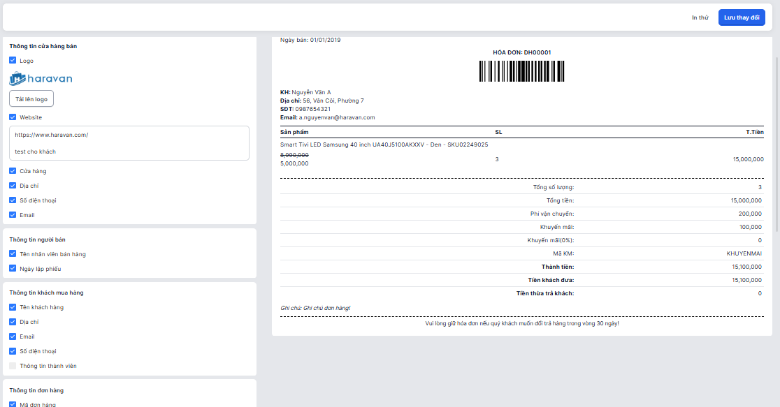 - Nhà bán chọn các thông tin muốn hiển thị trên hóa đơn trong danh sách Haravan cung cấp. Bấm Lưu thay đổi để lưu cập nhật.